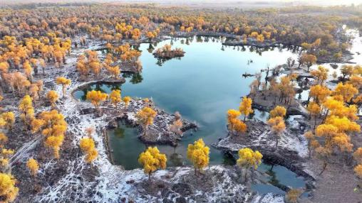 我院教师张雨涛的作品《驼声漫》,以沙雅县万亩胡杨林为背景,捕捉驼队穿行的画面,将“大漠驼铃”的苍茫意境与胡杨的坚韧质感融为一体,展现了西北生态的壮阔和深厚的人文韵味;学生周俊超的航拍《金杨环水 戈壁藏秋》,聚焦塔里木河与胡杨的共生之景,用细腻的构图与光影处理,呈现出“水绕金杨、秋藏戈壁”的灵动画面,凸显出年轻创作者对自然之美的独特感知。