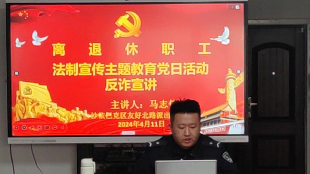 沙依巴克区友好北路派出所反诈宣传专干民警马志伟对线下离退休教职工作了“防范老年诈骗”教育宣讲活动。主要通过讲述诈骗典型案例、老年人反诈指南、如何预防养老诈骗等内容。