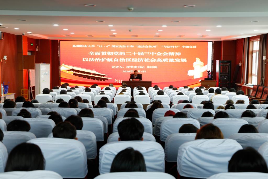 朱印岗书记以“全面贯彻党的二十届三中全会精神,以法治护航自治区经济社会高质量发展”为题,分别从深刻领悟党的二十届三中全会精神;深刻领悟法治护航经济高质量发展的重大意义;坚持全面依法治疆;坚持全面依法治校四个方面进行了宣讲。朱印岗书记要求干部师生认真学习贯彻习近平总书记关于新疆工作重要讲话重要指示批示精神,高举社会主义法治旗帜,大力弘扬法治精神,坚持依法治疆,坚持文化润疆,把全面依法治国要求落实到学校教育教学工作各个方面,营造好学校普法的良好校园氛围,不断增强各族干部师生尊法学法守法用法意识,引导干部师生办事依法、遇事找法、解决问题用法、化解矛盾靠法,切实保持学校持续稳定长期稳定。