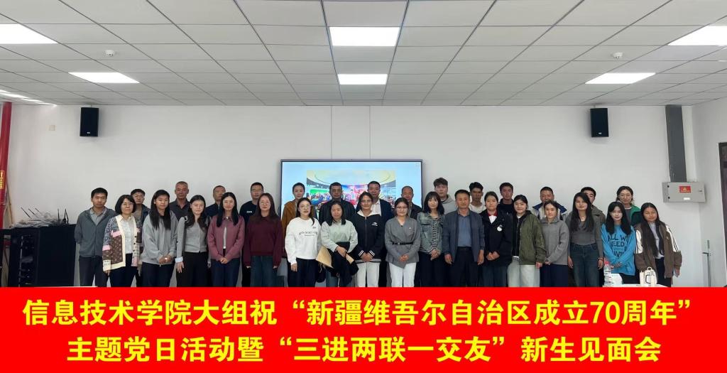 为庆祝新疆维吾尔自治区成立70周年,有形有感有效铸牢中华民族共同体意识,促进各族师生交往交流交融,持续推进信息技术学院大组“三进两联一交友”活动深入开展,9月25日下午,我校信息技术学院大组于3号教学楼3340A会议室开展庆祝“新疆维吾尔自治区成立70周年”主题党日活动暨“三进两联一交友”新生见面会,信息技术学院、马克思主义学院以及组织部人事处等交友老师以及交友学生代表共30余人参加。