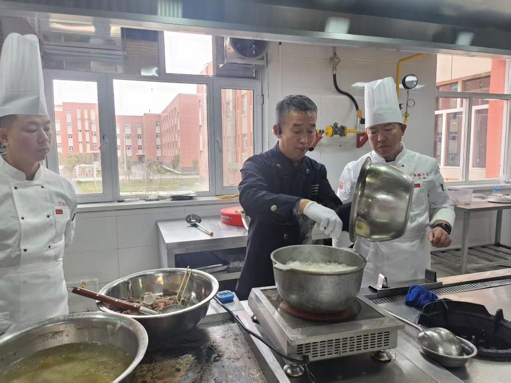 活动中肖龙付大师进行新疆非遗传承抓饭现场制作,结合自身的创业发展介绍了新疆菜的特点及餐饮业的发展趋势,与师生代表共话匠心精神与职业规划,并通过现场的烹饪演示展现传统技艺的创新活力,在抓饭的制作中做到出品可复制,技术可复制,培训可复制。