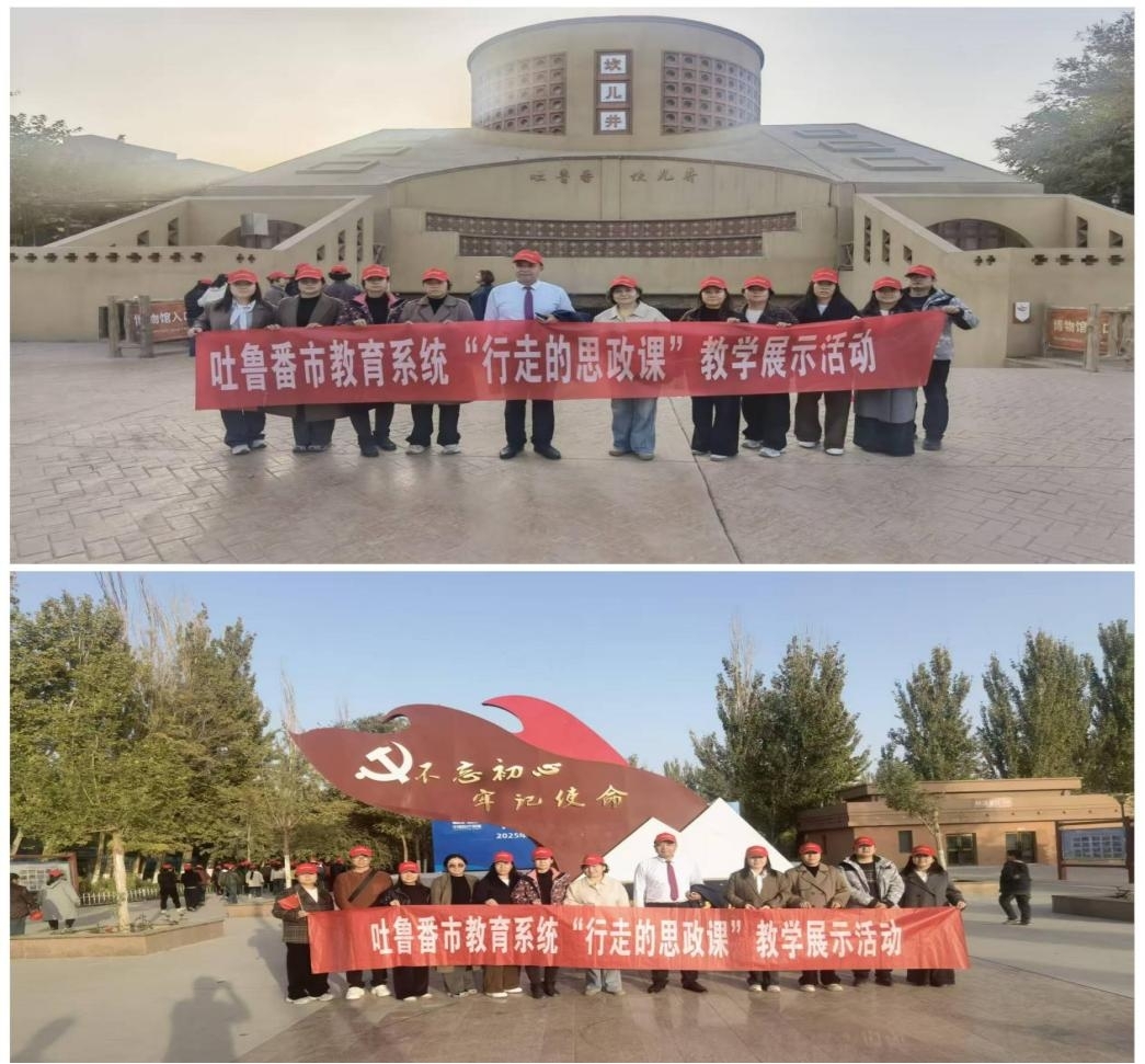“行走的思政课”别开生面,创新实践教学模式。这一环节是本次活动的最大亮点,旨在通过实地、实景、实情的教学,让思政课“活”起来、“动”起来。在组织方统一安排下,包括我校教师在内的150名思政课教师集体乘车,奔赴吐鲁番多个具有深厚历史文化和鲜明地域特色的教学点进行观摩学习。