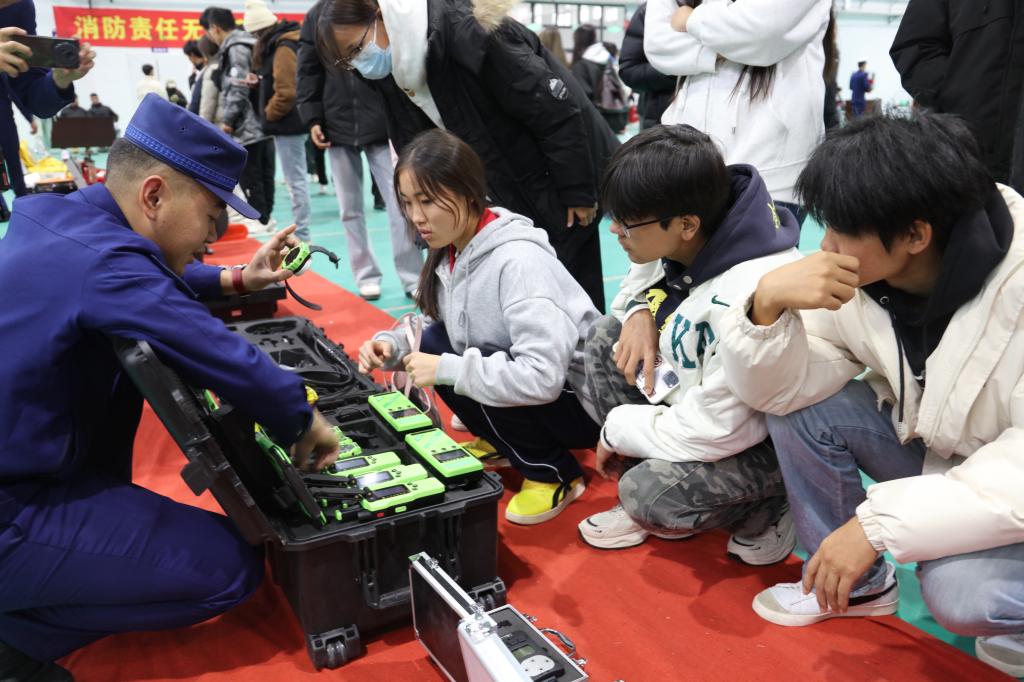 活动现场,消防队员展示了液压破拆工具、热成像仪、无人机灭火设备等高精尖消防救援器材,详细讲解其功能与应用场景。师生积极参与互动,亲身体验消防战斗服穿戴及灭火器操作,近距离感受消防工作的专业性与科技力量。
