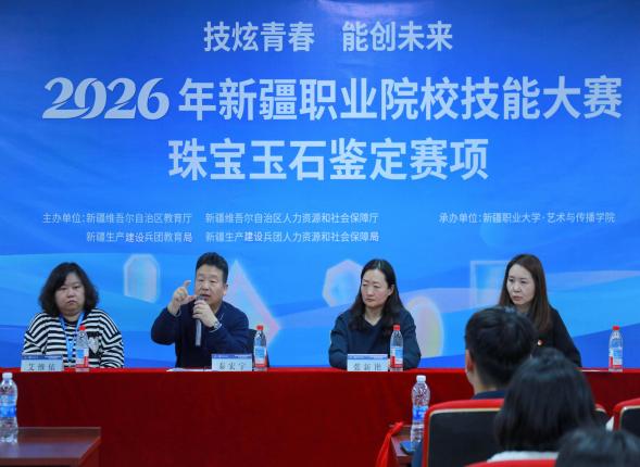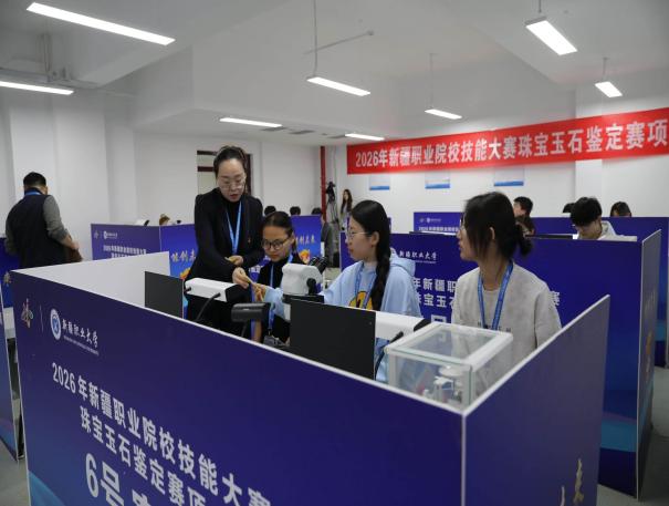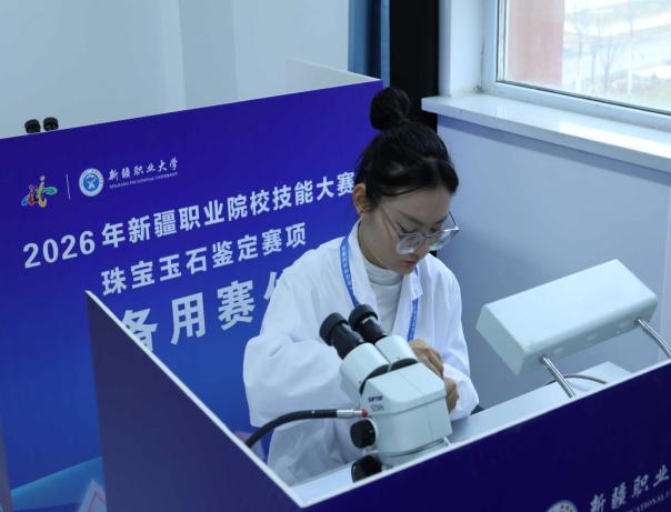 11月6日至11月7日,我校艺术与传播学院成功承办“2026年新疆职业院校技能大赛‘珠宝玉石鉴定赛项’”。大赛以“技炫青春,能创未来”为主题,设置学生组团体赛与教师组团体赛,吸引全疆6所高校的30名师生选手同台竞技,师生们以精湛技艺切磋专业本领,在赛场中传承珠宝玉石文化精髓,为行业人才培养注入新动能。