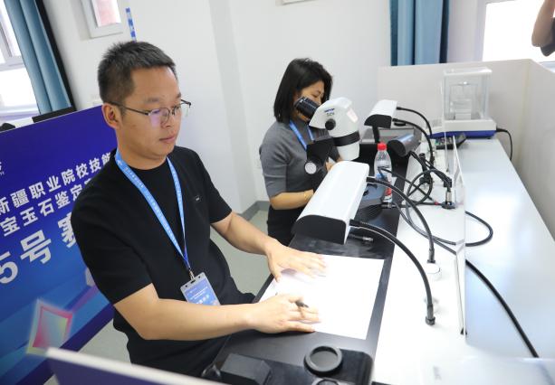 值得关注的是,本次教师赛也是一大亮点。来自全疆不同高校的教师选手们同台竞技,以严谨的专业态度、精湛的鉴定技艺展现行业标杆风采。他们在赛场上的专注与专业,不仅为学生选手树立了鲜活的学习榜样,更通过“以赛促教”的方式,推动职业院校珠宝玉石鉴定专业教学水平的提升。