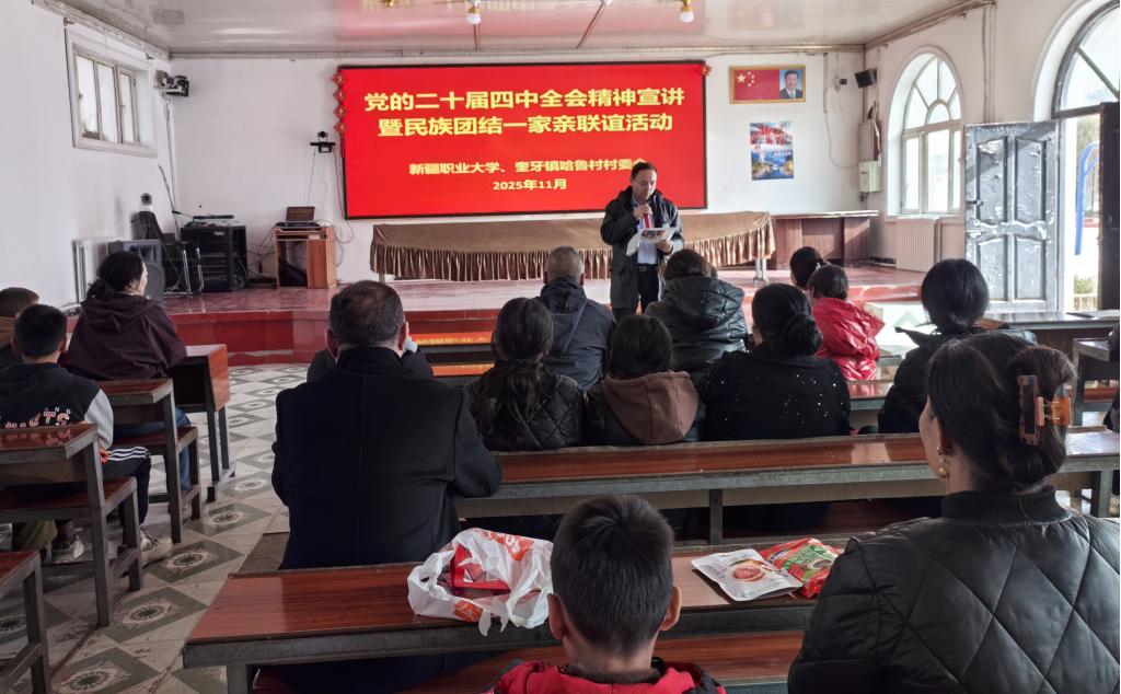 11月9日,在墨玉县哈鲁村的大讲堂里,结亲干部、驻村干部和村民们欢聚一堂开展“党的二十届四中全会精神宣讲暨民族团结一家亲”联谊活动。宣讲员围绕党的二十届四中全会提出的“铸牢中华民族共同体意识,推进中华民族共同体建设”重要部署,结合和田地区墨玉县的发展成就与民生福祉改善实例,用通俗易懂的语言解读全会精神要义,引导大家深刻认识坚持党的领导是民族团结进步的根本保证。