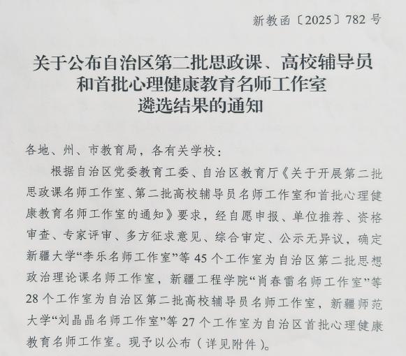 近日,自治区教育厅正式公布了自治区第二批思政课、高校辅导员以及首批心理健康教育名师工作室的遴选结果。我校周永启老师主持的辅导员工作室成功入选,荣获“自治区第二批高校辅导员名师工作室”称号。这是学校在思想政治工作创新与辅导员队伍专业化建设中取得的阶段性成果。