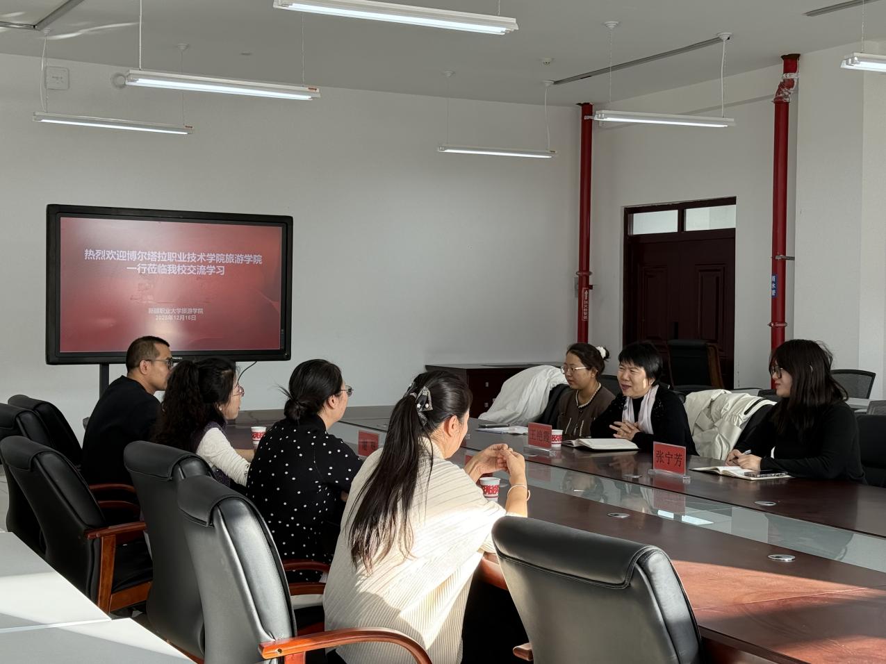 为深化职业教育领域校际合作,共探旅游专业人才培养创新路径,12月16日,博尔塔拉职业技术学院旅游学院书记王艳霞、教研室主任张宁芳、专任教师乔文静莅临我校旅游学院交流学习。我校旅游学院主要负责人谢辉、副书记马俊和副院长王海燕热情接待,双方围绕专业建设、课程改革、校企合作等关键议题展开深度对话。
