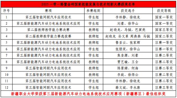 作为经金砖国家工商理事会批准、列入中国高等教育学会竞赛目录的教育部白名单A类国际性赛事,本次大赛行业认可度高、国际影响力广。赛事中,我校智慧交通学院选派的三支队伍表现亮眼、捷报频传:合肥赛区智能网联汽车应用技术赛项国内决赛上,李林静、徐晓龙同学摘得一等奖(金奖),孙文革、鲁亚云获评优秀指导教师;哈尔滨赛区新能源汽车动力电池系统技术应用赛项国内决赛中,刘豪、徐华山同学再夺一等奖(金奖);珠海赛区教学能力赛项国内决赛上,赵晓龙、马铖、巴寅亮三位教师荣获三等奖(铜奖)。一系列佳绩集中展现了学院师生扎实的专业素养与精湛的技能水平。