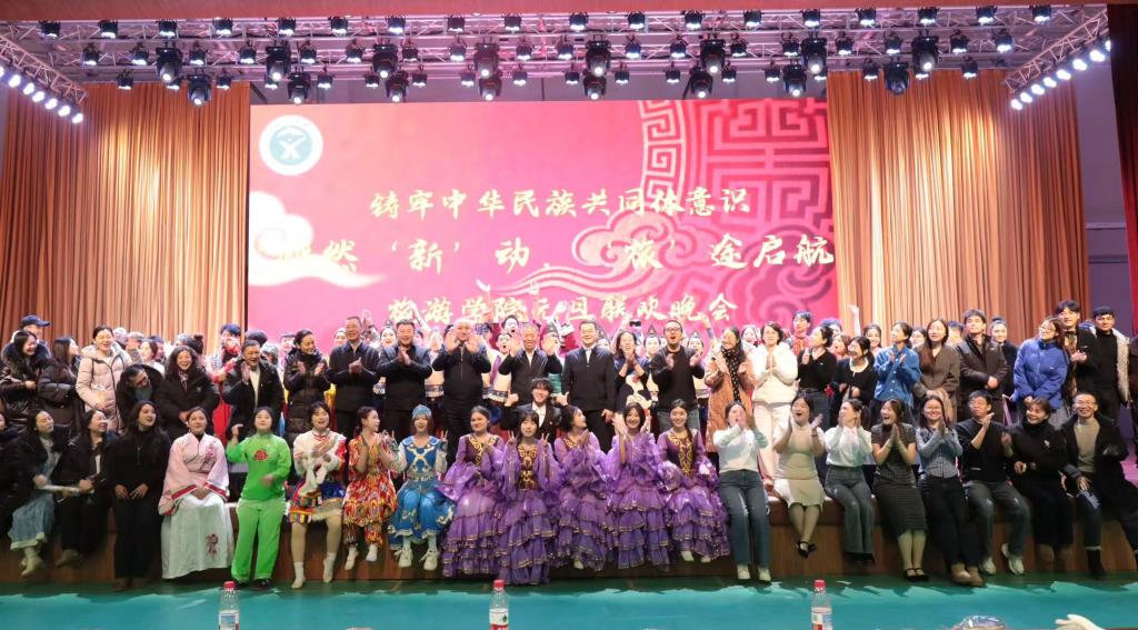 辞旧迎新启华章,民族团结谱新篇。12月30日晚,我校旅游学院“怦然‘新’动,‘旅’途启航”元旦联欢晚会在体育馆三楼大礼堂精彩上演。这场紧扣铸牢中华民族共同体意识主线的文艺盛宴,汇聚多元艺术形式,融合民族文化特色,成为学院校园文化建设与民族团结进步教育的生动实践。