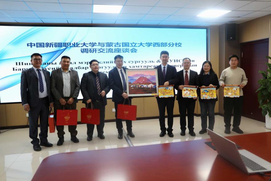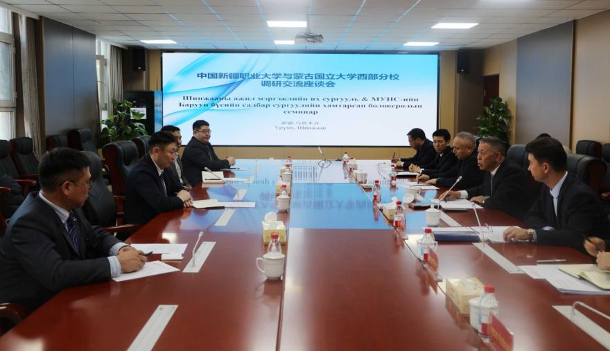 近日,蒙古国国立大学西部分校校长策·普日布苏荣一行4人莅临我校访问交流。校党委书记黄朝华、校党委副书记、校长阿不力克木·阿不德卡德尔出席座谈会,校党委常委、副校长肖克拉提·米尔扎陪同参观并参加座谈。
