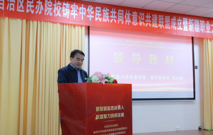 校党委常委、宣传部部长周全新在致辞中介绍了我校思政教育改革创新成果。近年来我校依托自治区高校思政课杨柯名师工作室,发挥名师辐射引领作用,打造虚拟实景红色育人中心,持续推进XR平台建设,培育“五红”活动特色品牌,组织学生走进自治区博物馆、乌鲁木齐烈士陵园等开展教学实践。他表示,我校作为联盟指导单位,将秉持优势互补、资源共享、协同共进、互利共赢原则,以数字技术为支撑,与联盟院校共享思政资源、共育师资队伍、共推科研创新,让联盟成为凝聚共识、协同发展的桥梁纽带。