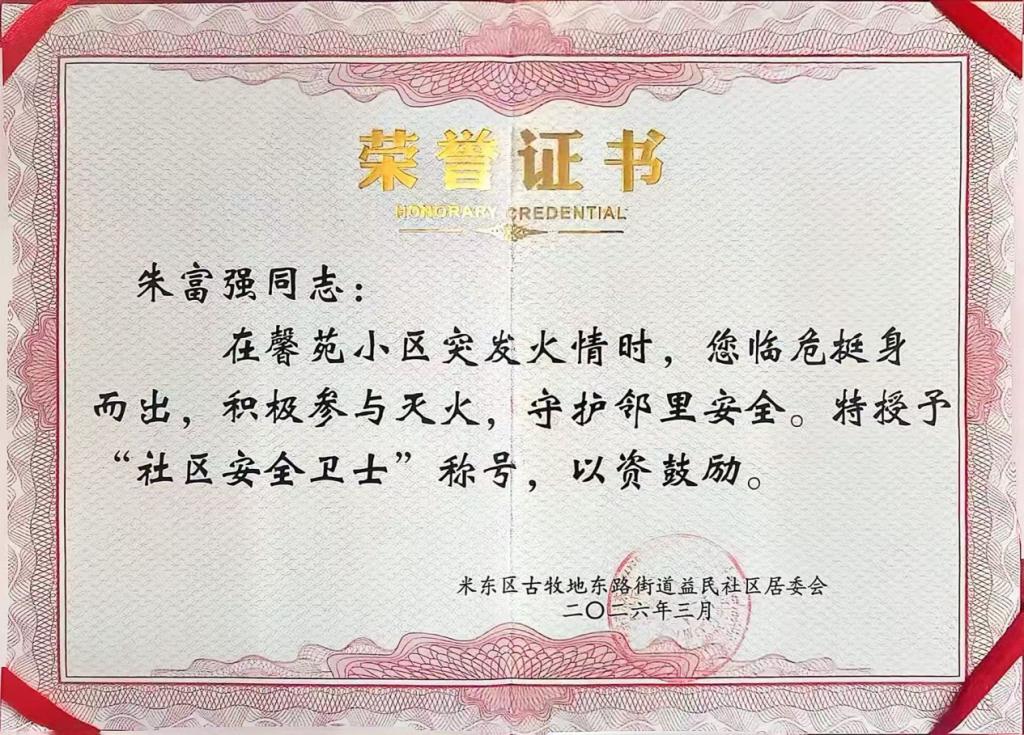危急关头,容不得丝毫迟疑。朱富强同学沉着冷静、处变不惊,迅速冲向物业值班室取来灭火器,凭借熟练的操作技巧,对准火源根部精准扑救。一系列动作干脆利落、专业果断,在他的快速处置下,火情被成功扑灭,重大安全隐患被彻底消除,为邻里筑起了一道坚不可摧的安全防线,成功避免了一场可能造成严重后果的安全事故。更令人动容的是,完成救援后,朱富强同学默默返回家中,对此次英勇之举只字未提,从未向学校、家人主动诉说,更未寻求任何表彰与感谢,直至社区工作人员核实事迹、主动上门送来荣誉证书,学校师生才知晓这位低调少年的暖心善举。