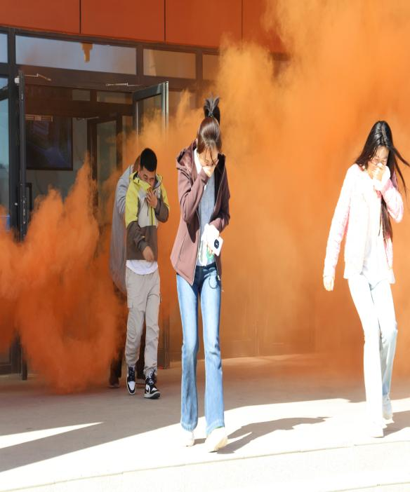 随着指挥中心下达指令,应急警报响起,疏散演练正式开始。教职工们迅速反应,弯腰捂鼻、紧贴墙壁,沿指定安全通道快速有序撤离,在楼层引导员指挥下,全程无拥挤、无慌乱,顺利抵达安全区域。各部门随即清点人数并逐级上报,整个疏散过程紧凑高效、秩序井然。