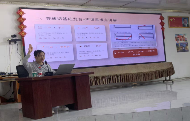 课堂上,结亲我校教务处副处长、国家级普通话水平测试员结亲教师汪岩武采用“理论讲解+场景模拟+互动实训”模式,紧扣村民日常需求设计内容。从邻里聊天、农产品线上线下销售,到外出务工沟通,重点讲解基础发音、声调辨析和实用短句。通过逐句跟读、情景演练、小组对练等趣味方式,手把手纠正发音。