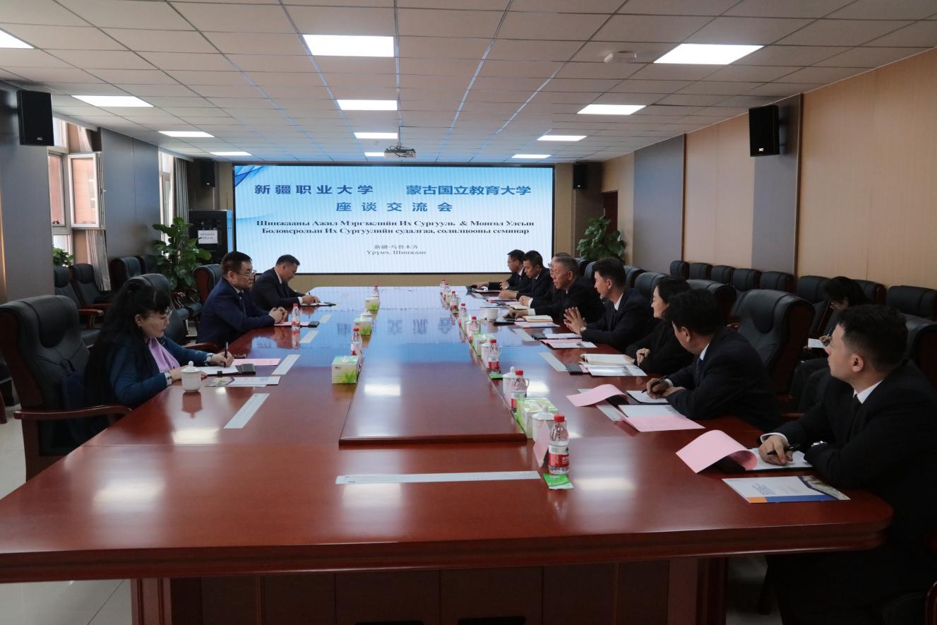 交流座谈会上,阿不力克木·阿不德卡德尔校长代表学校对蒙方代表团到访表示热烈欢迎,详细介绍我校办学历史、学科专业建设、师资队伍、育人成果及对外开放交流情况,强调我校致力于推进职业教育国际化,服务国家向北开放战略。
